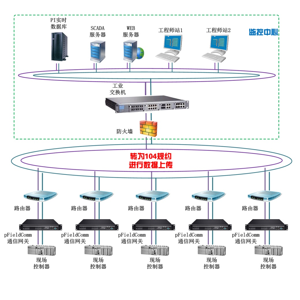 根據項目要求在每個現場控制端均配備pFieldComm工業通信網關一臺。網關中內置多種通信協議,可根據現場控制端的設備通信協議要求采集數據,再轉換成監控中心數據平臺PI實時數據庫要求的電力104規約,實現數據交互傳輸。