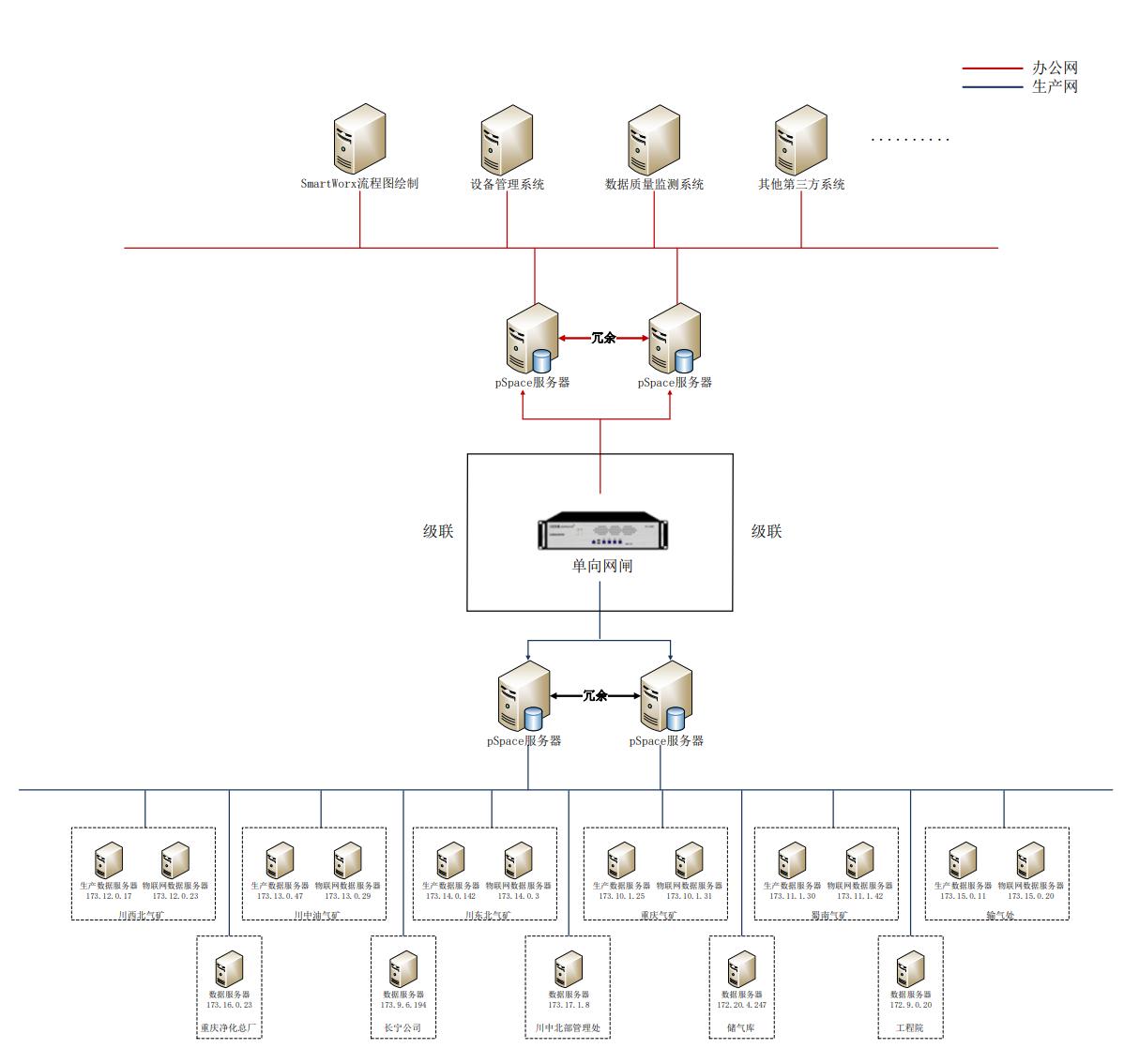 系統主要包括pSpace實時歷史數據庫、FSmartWorx云端可視化軟件、資產設備建模系統、數據質量分析系統。需要配備的硬件包括實時服務器(熱備冗余)、歷史服務器(熱備冗余)、磁盤陣列柜、Web服務器、UPS電源、網絡設備等;層級之間配備了隔離網關等安全設備保證系統信息安全。