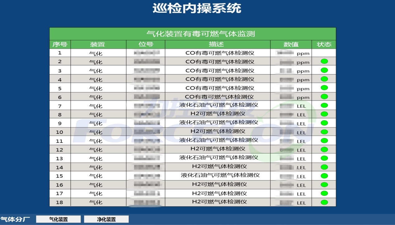 有毒可燃?xì)怏w的監(jiān)測(cè)是安全環(huán)保的重中之重,也是安全生產(chǎn)的保障。本項(xiàng)目中采用表格形式,直觀展示各個(gè)有毒可燃?xì)怏w檢測(cè)點(diǎn)的氣體濃度值。并根據(jù)濃度閾值,以不同顏色顯示。實(shí)現(xiàn)有毒可燃?xì)怏w濃度的集中管理。