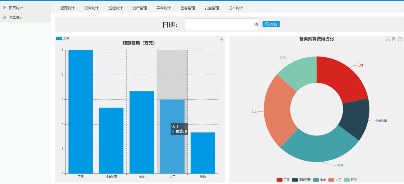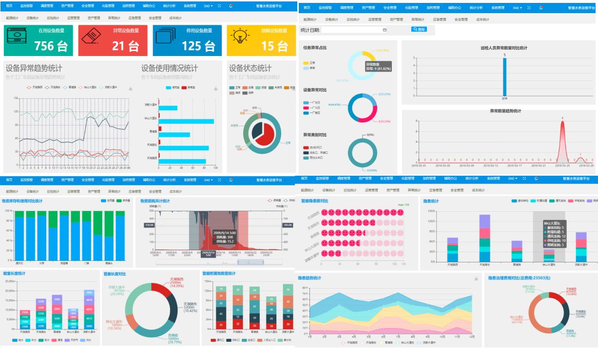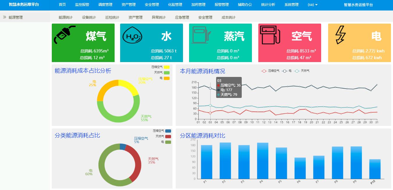 建立藥耗控制與分析系統,可根據采集的信息提前計算生產需要的碳源、PAC等藥劑的投加量,加藥前后指標變化趨勢,并進行加藥自動控制,并可分析出任意時間段內各單元的藥耗,生成日報、月報、年報??蓪崿F對藥耗生產運行成本進行分析控制和藥劑管理。對用能分類分項進行同環比分析,以棒圖、餅圖、報表等形式展示,讓用戶更直觀、快速地了解藥耗信息。