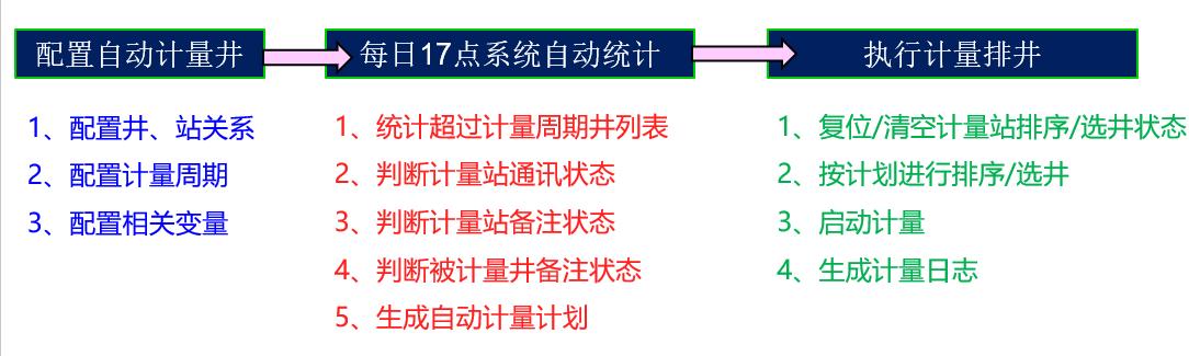 常規的計量方式需要先完成計量計劃的制定,然后向計量人員下發,計量人員按照紙質計量計劃單進行手動選井計量,單手動選井計量的工作就需要1~2人每天花費30分鐘以上的時間才能完成,且不保證存在人為疏忽的可能性。本次開發的自動計量功能,最終可實現人工預配置單井計量周期,系統每日17點自動進行統計哪些井超過預定時間,系統自動將超過預定時間的井進行排井計量。