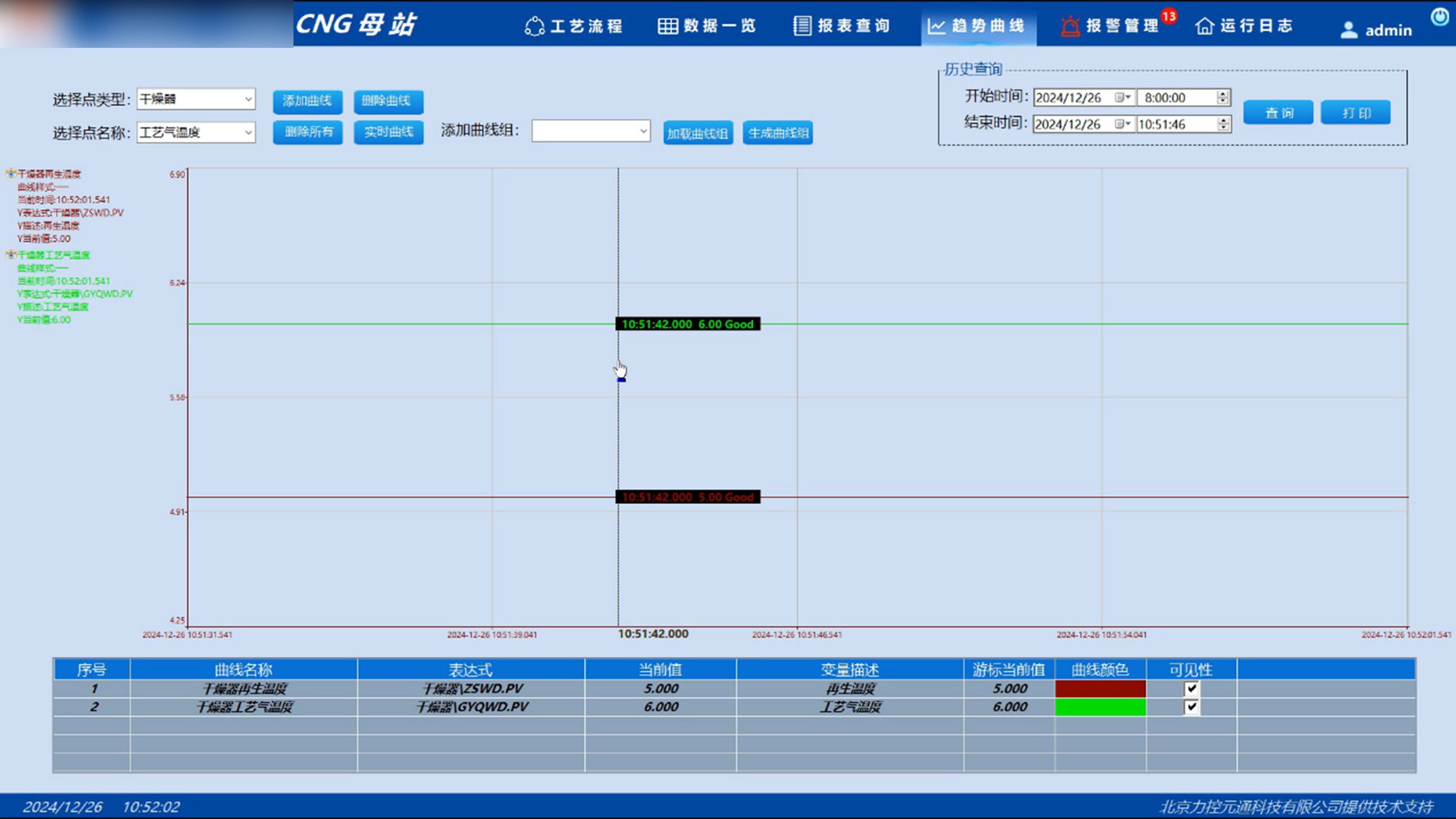 CNG加氣母站站控系統(tǒng)通過集成壓縮機(jī)升壓、工藝管道控制、加氣機(jī)管理等子系統(tǒng),實現(xiàn)了天然氣壓縮、凈化、儲存及加注等過程的全面自動化控制,借助遠(yuǎn)程數(shù)據(jù)采集與智能診斷顯著提升生產(chǎn)效率和設(shè)備可靠性,有效降低人工操作強度與失誤率。系統(tǒng)支持實時/歷史趨勢圖分析功能,操作人員可通過動態(tài)曲線對比歷史同期數(shù)據(jù),追蹤壓縮機(jī)溫度、壓力等關(guān)鍵參數(shù)變化趨勢,并可將多組曲線組合保存以便快速調(diào)用,助力系統(tǒng)持續(xù)優(yōu)化運行。