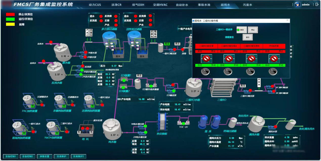 系統按動力CUS、潔凈CR、排氣EXH、空調HVAC、自動補水、事故水池、超純水、污廢水等八大子系統進行流程可視化展示,覆蓋生產工藝用水、恒溫恒濕恒壓環境控制及廢氣廢水處理等環節。實時監測運行狀態與工藝參數,優化調節PID參數,保障生產環境穩定可靠。
