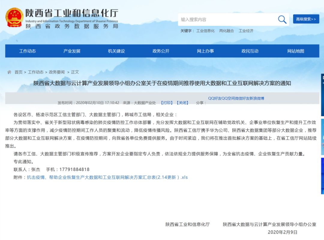 2020年2月9日,陜西省工業和信息化廳發布《陜西省大數據與云計算產業發展領導小組辦公室關于在疫情期間推薦使用大數據和工業互聯網解決方案》的通知。旨在充分發揮大數據和工業互聯網在輔助黨政機關、企事業單位恢復生產和提升工作效率等方面的支撐作用,減少疫情防控期間工作人員的聚集和流動,降低疫情傳播風險。