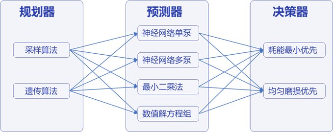 決策器根據(jù)控制器生成的方案與預測器對方案能耗及特性曲線的建模,選擇出滿足工況需要的且能耗最低的控制方案,包括選擇工作機器的編號及參數(shù)。