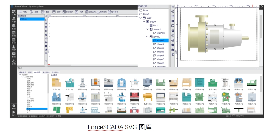 ForceSCADA軟件支持用戶將制作好的SVG文件在圖庫界面進行導入,導入后的圖片支持二次組態編輯。通過設置SVG元素的腳本動作、數據輸入輸出等參數,制作成動態圖庫。