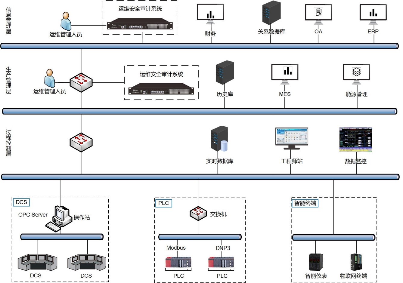 在信息管理層和生產(chǎn)管理層部署堡壘機(jī),對(duì)服務(wù)器、網(wǎng)絡(luò)設(shè)備、安全設(shè)備進(jìn)行日常操作與運(yùn)維的安全防護(hù),使用數(shù)字證書作為數(shù)據(jù)庫(kù)系統(tǒng)身份認(rèn)證方式。強(qiáng)制規(guī)定密碼復(fù)雜度規(guī)則、密碼有效時(shí)限、密碼長(zhǎng)度、密碼嘗試次數(shù)、密碼鎖定等。僅設(shè)置一位管理員具備系統(tǒng)權(quán)限,其余數(shù)據(jù)庫(kù)賬號(hào)僅授予能夠滿足使用需求的最小權(quán)限。堡壘機(jī)扮演著看門者的職責(zé),所有對(duì)網(wǎng)絡(luò)設(shè)備和服務(wù)器的請(qǐng)求都要從這扇大門經(jīng)過(guò)。因此安全管理與審計(jì)系統(tǒng)能夠攔截非法訪問(wèn)和惡意攻擊,對(duì)不合法命令進(jìn)行阻斷、過(guò)濾掉所有對(duì)目標(biāo)設(shè)備的非法訪問(wèn)行為并記錄詳細(xì)信息。堡壘機(jī)具備輸入輸出審計(jì)功能,不僅能夠詳細(xì)記錄用戶操作的每一條指令,而且能夠?qū)⑺械妮敵鲂畔⑷坑涗浵聛?lái);具備審計(jì)回放功能,能夠模擬用戶的在線操作過(guò)程,豐富和完善了網(wǎng)絡(luò)的審計(jì)功能。安全管理與審計(jì)系統(tǒng)能夠在自身記錄審計(jì)信息的同時(shí)在外部某臺(tái)計(jì)算機(jī)上做存儲(chǔ)備份,可以極大增強(qiáng)審計(jì)信息的安全性,保證審計(jì)人員有據(jù)可查。系統(tǒng)管理員可以通過(guò)多種查詢條件查看審計(jì)信息。堡壘機(jī)保護(hù)單位內(nèi)部網(wǎng)絡(luò)設(shè)備及服務(wù)器資源的安全性,使得單位內(nèi)部網(wǎng)絡(luò)管理合理化和專業(yè)化。