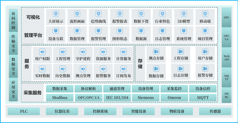* 應用服務層集成 HMI 設計、報警管理等功能;網絡傳輸層通過加密技術確保數據安全傳輸;