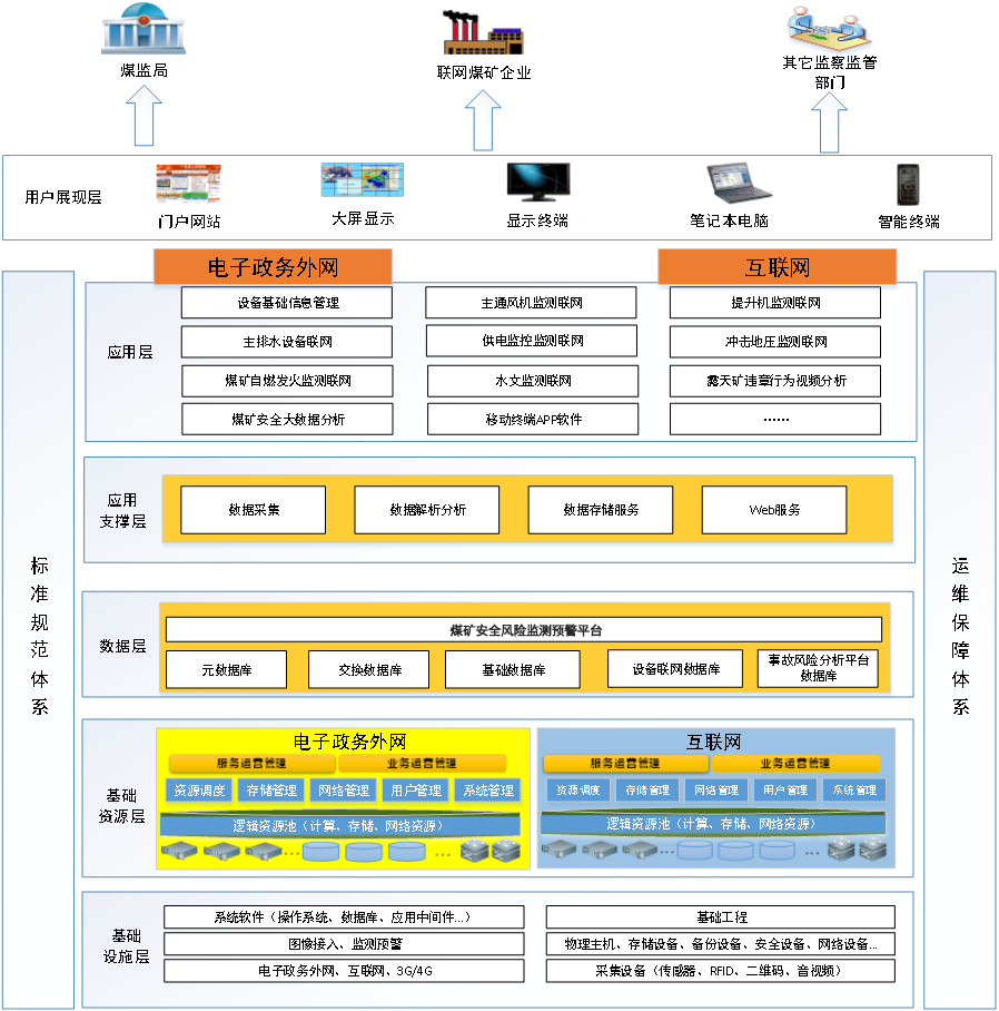 煤礦安全風(fēng)險監(jiān)測預(yù)警系統(tǒng)解決方案依據(jù)國家煤礦安監(jiān)局關(guān)于加快推進(jìn)煤礦安全風(fēng)險監(jiān)測預(yù)警系統(tǒng)建設(shè)的指導(dǎo)意見,綜合利用物聯(lián)網(wǎng)、大數(shù)據(jù)、云計算與移動互聯(lián)等相關(guān)技術(shù),接入具備條件礦井的重大設(shè)備與監(jiān)測監(jiān)控系統(tǒng)數(shù)據(jù),實現(xiàn)煤礦設(shè)備基礎(chǔ)信息管理、重大設(shè)備與監(jiān)測監(jiān)控系統(tǒng)聯(lián)網(wǎng)、露天礦違章行為視頻識別、煤礦安全大數(shù)據(jù)分析等功能為一體的安全風(fēng)險監(jiān)測預(yù)警系統(tǒng),為政府監(jiān)管監(jiān)察、煤炭企業(yè)服務(wù),督促企業(yè)落實安全風(fēng)險防控主體責(zé)任,為循數(shù)管控、分級監(jiān)管、精準(zhǔn)執(zhí)法提供信息化支撐保障。