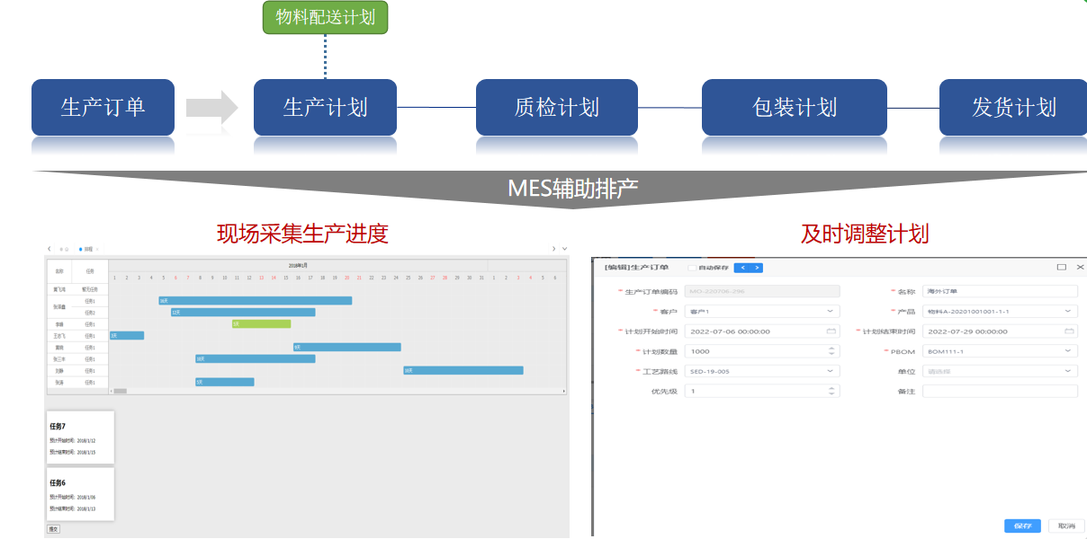 MES 系統(tǒng)接收頂層 ERP下發(fā)的生產計劃,通過排產算法結合管理者的意愿、其他信息系統(tǒng)的數據、和當前物料信息、設備狀態(tài)等關鍵信息,分解成生產計劃并生成對應工位的詳細工單,指導生產。
