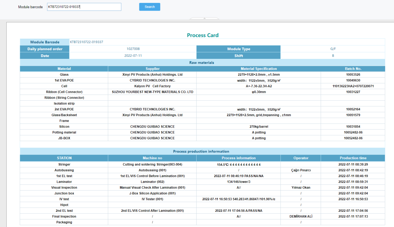 由原料采購入庫開始,對每批次原材料的采購信息進行詳細記錄,生成原料入庫質檢結果和批次信息的一一對應,在后期生產領料、粘膠、切片、清洗、串焊、敷設、測試、層壓、組框、固化、分檔和包裝入庫、出庫的整個環(huán)節(jié)采用條碼批次掃描,達到生命周期的全過程可追溯性。