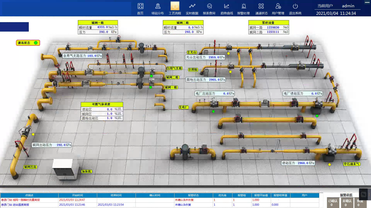 生產運行監控主要借助SCADA系統將分布在管轄區域內場站、閥室、調壓站、用戶、加氣站所采集的管網設備的運行參數匯集上來,從而掌握整個管網的運行情況,并對運行設備進行實時監控。系統出入口采用GIS地圖和場站檢索組合方式,可通過地圖查看也可通過搜索進入該場站。